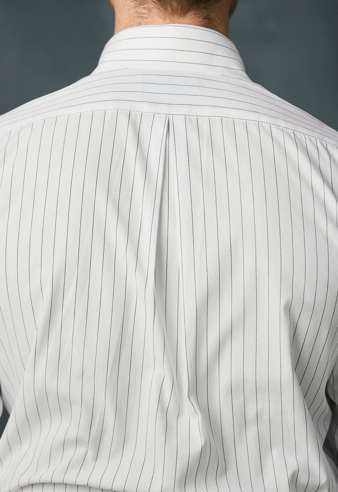 En hvid skjorte med tynde sorte striber er et elegant valg for den moderne mand, der ønsker et klassisk, men alligevel iøjnefaldende look. Hos TailorMate tilbyder vi en skræddersyet skjorte med subtile sorte striber, der er placeret med cirka 2 cm mellemrum. Denne skjorte kombinerer den tidløse hvide base med en diskret detalje, der tilføjer dybde og karakter til dit outfit.