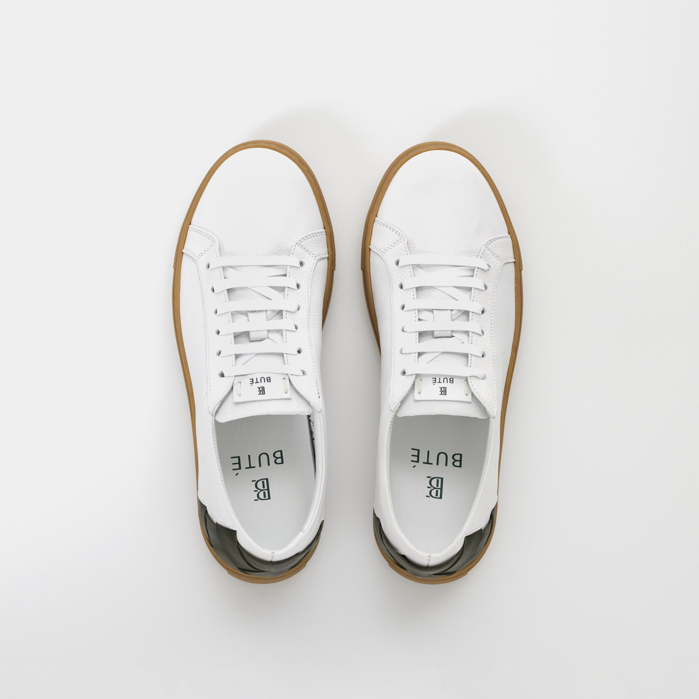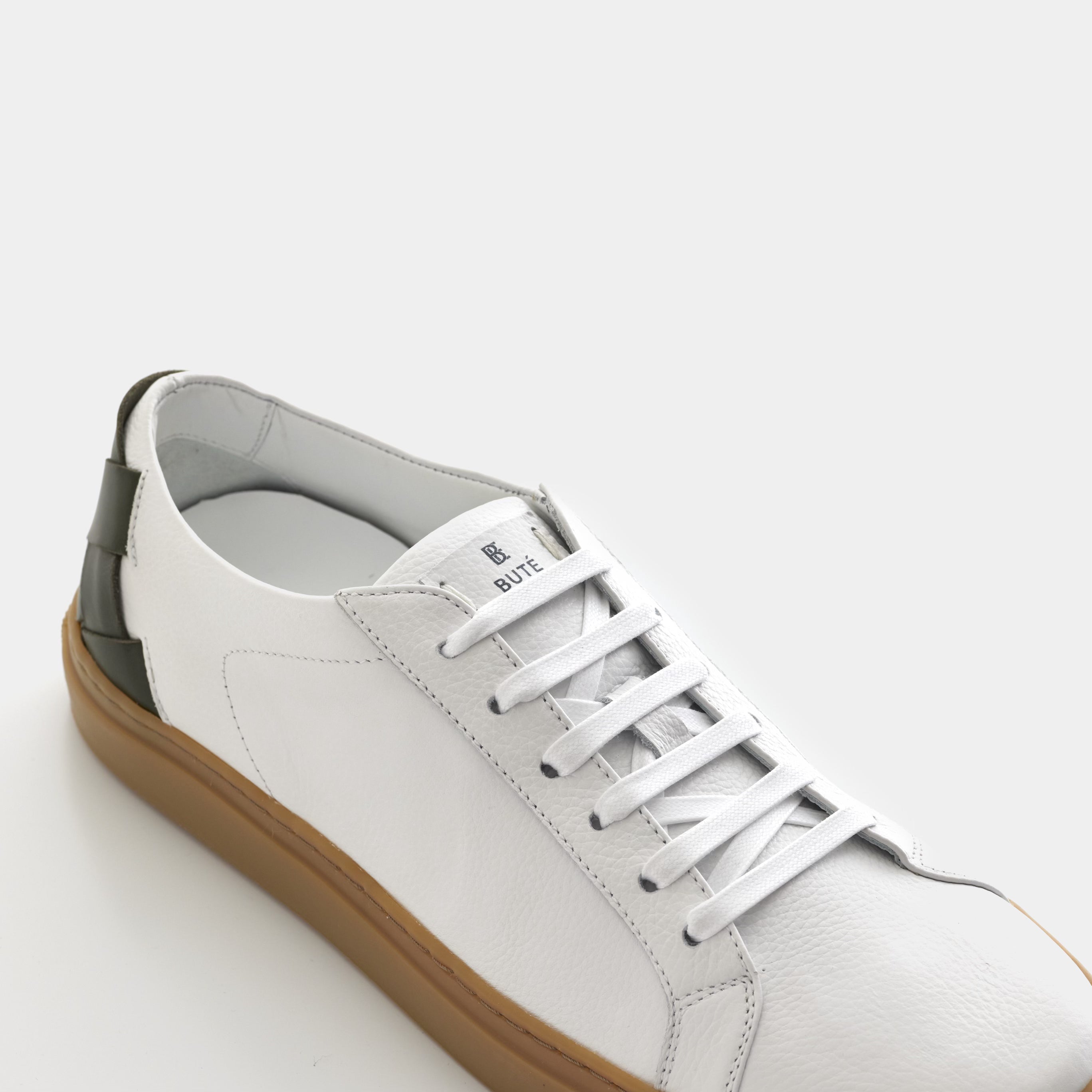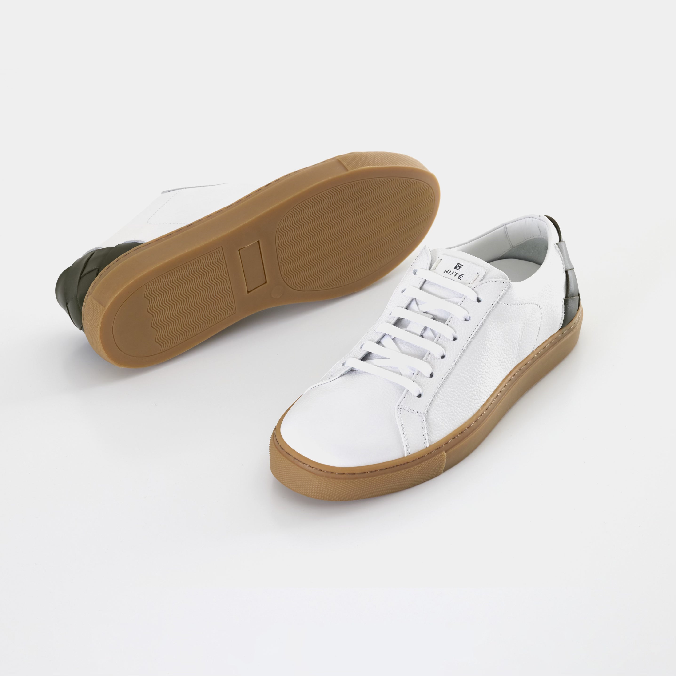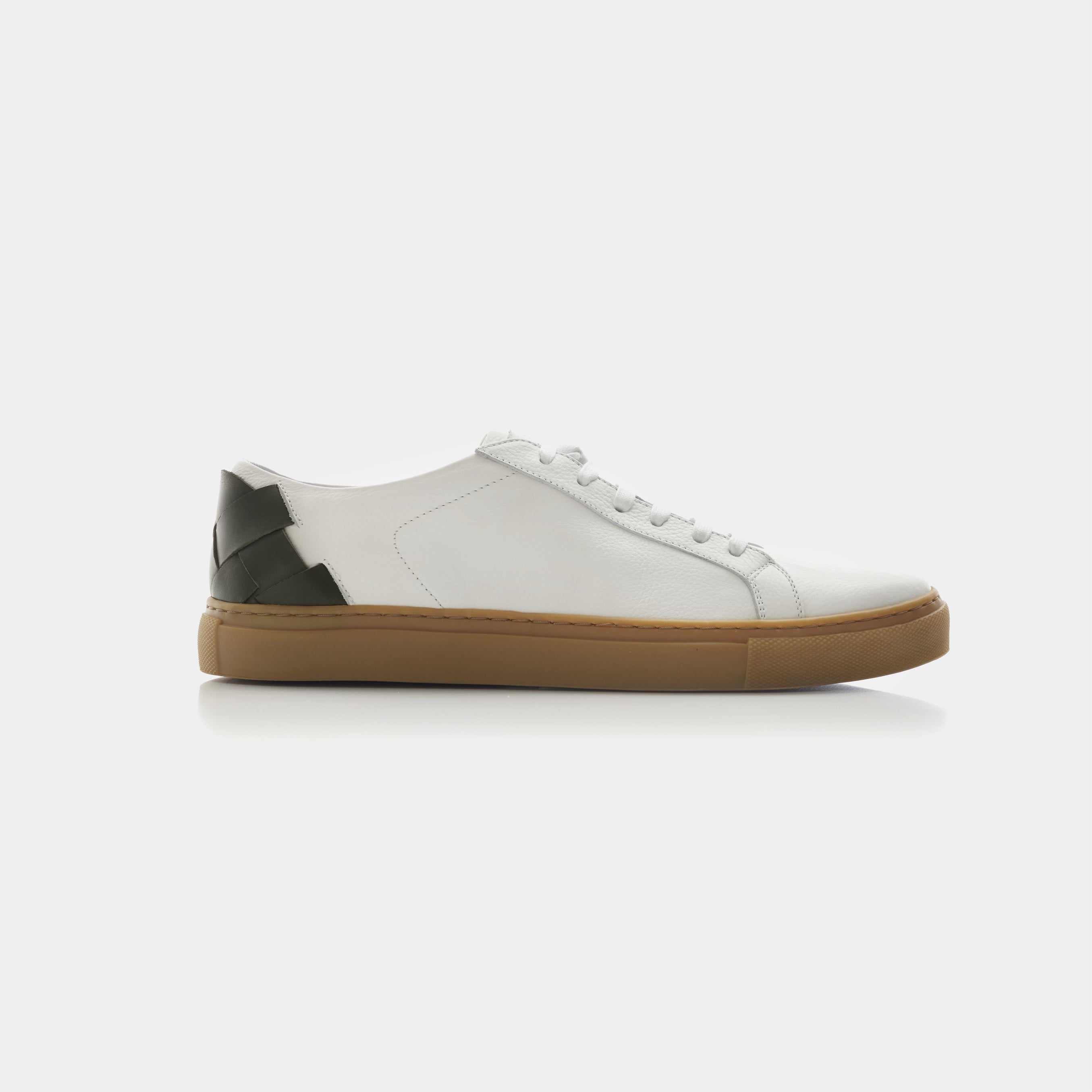 Hvid sneaker med grøn fletdetalje på hælen og sandfarvet gummisål. Macerata sneaker er lavet i 100% Italiensk kalvelæder og med sål af soft compound for forbedring og understøttelse af din holdning.