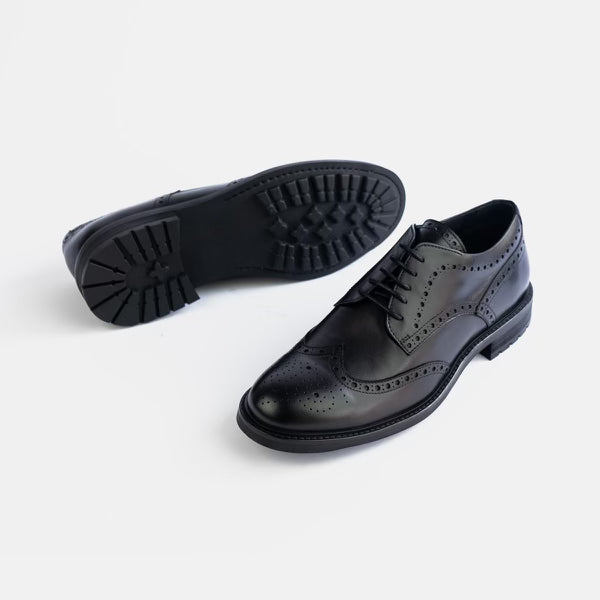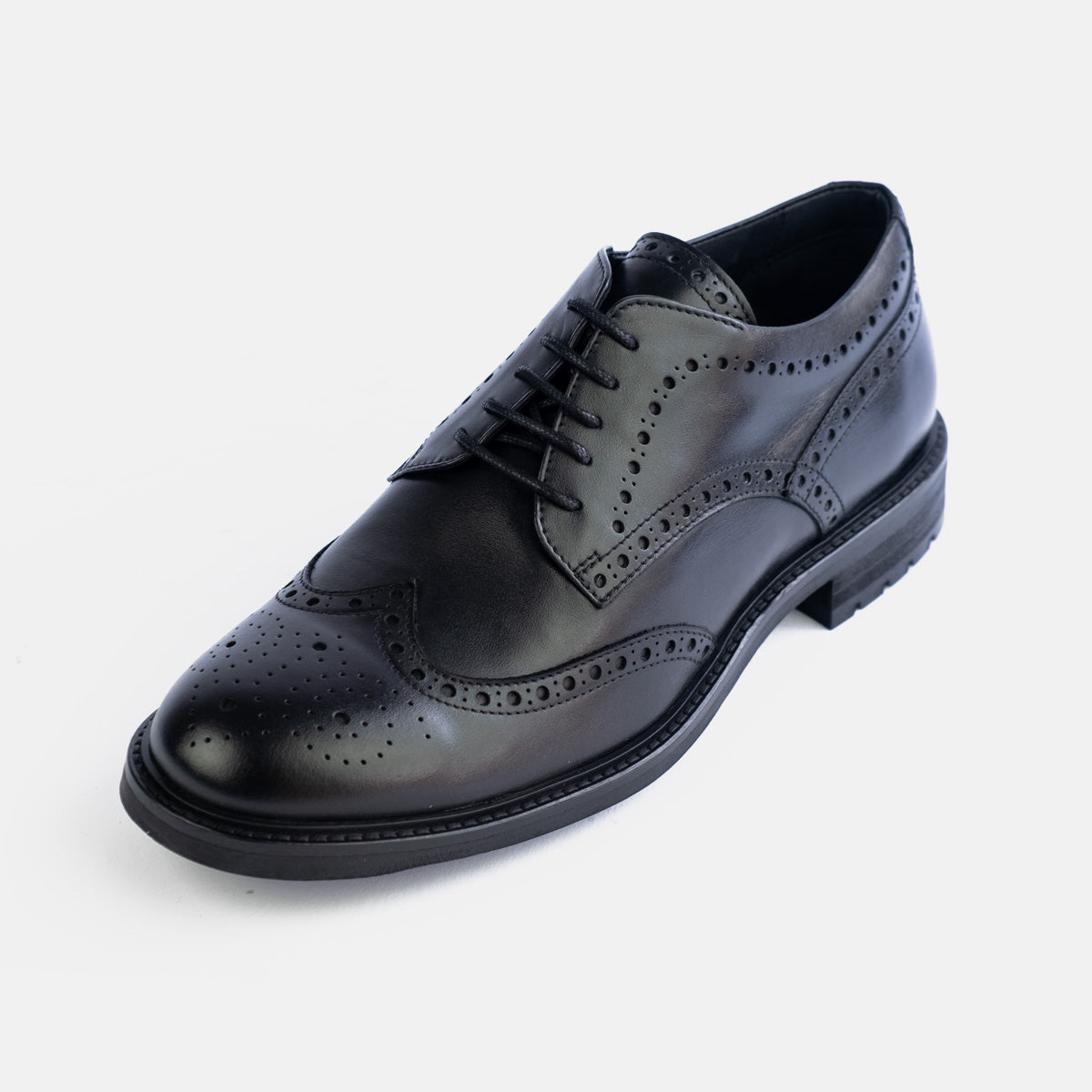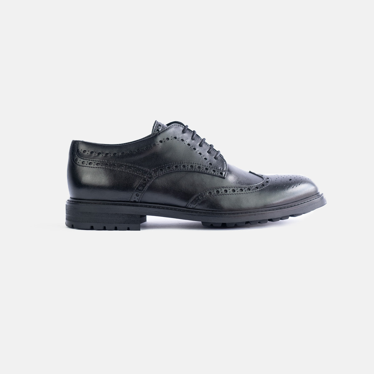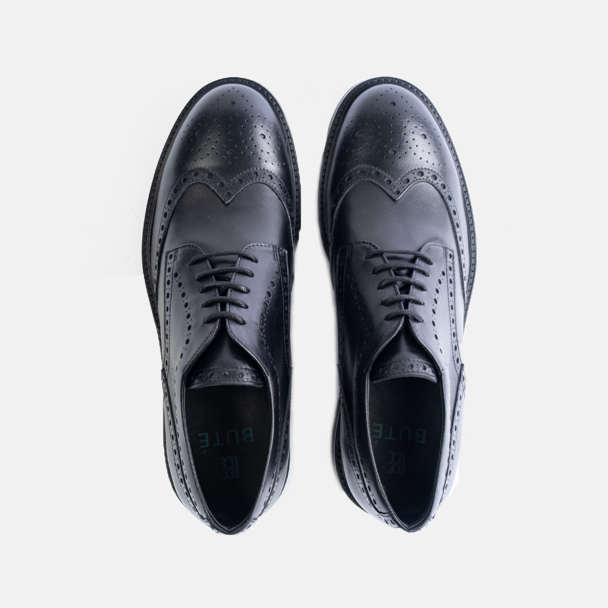 Sort derby-inspireret round toe med broderede detaljer. Spiga round toe er lavet i 100% Italiensk kalvelæder og med en polstret lædersål for ultimativ komfort og fodens velbefindende. Skoene er unisex og fås både til mænd og kvinder.