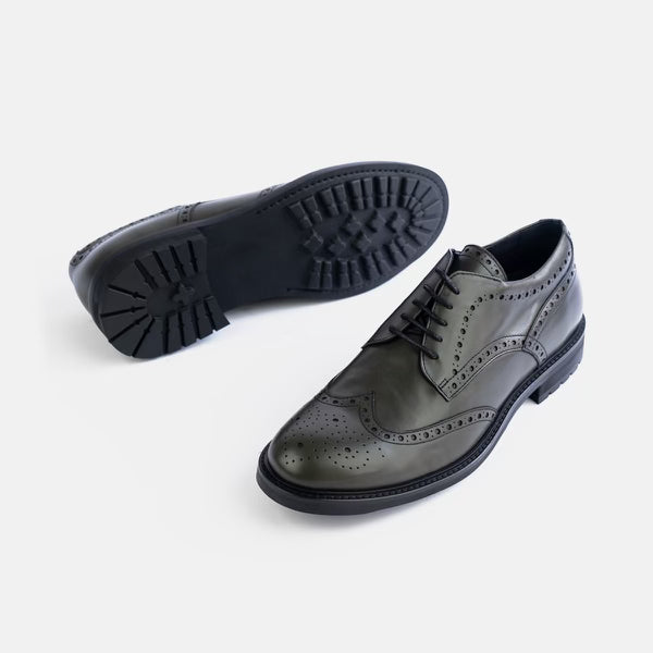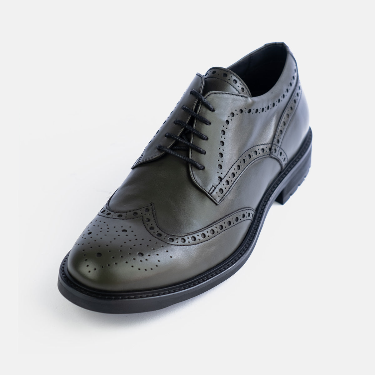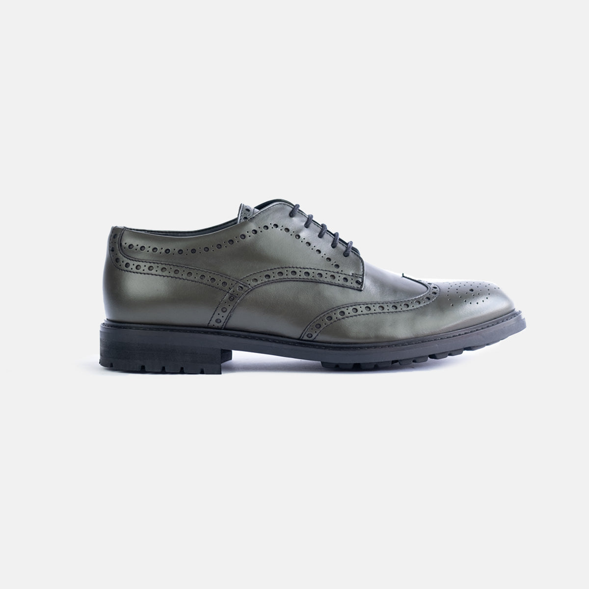 Mørkegrøn derby-inspireret round toe med broderede detaljer. Spiga er lavet i 100% Italiensk kalvelæder og med en polstret lædersål for ultimativ komfort og fodens velbefindende.